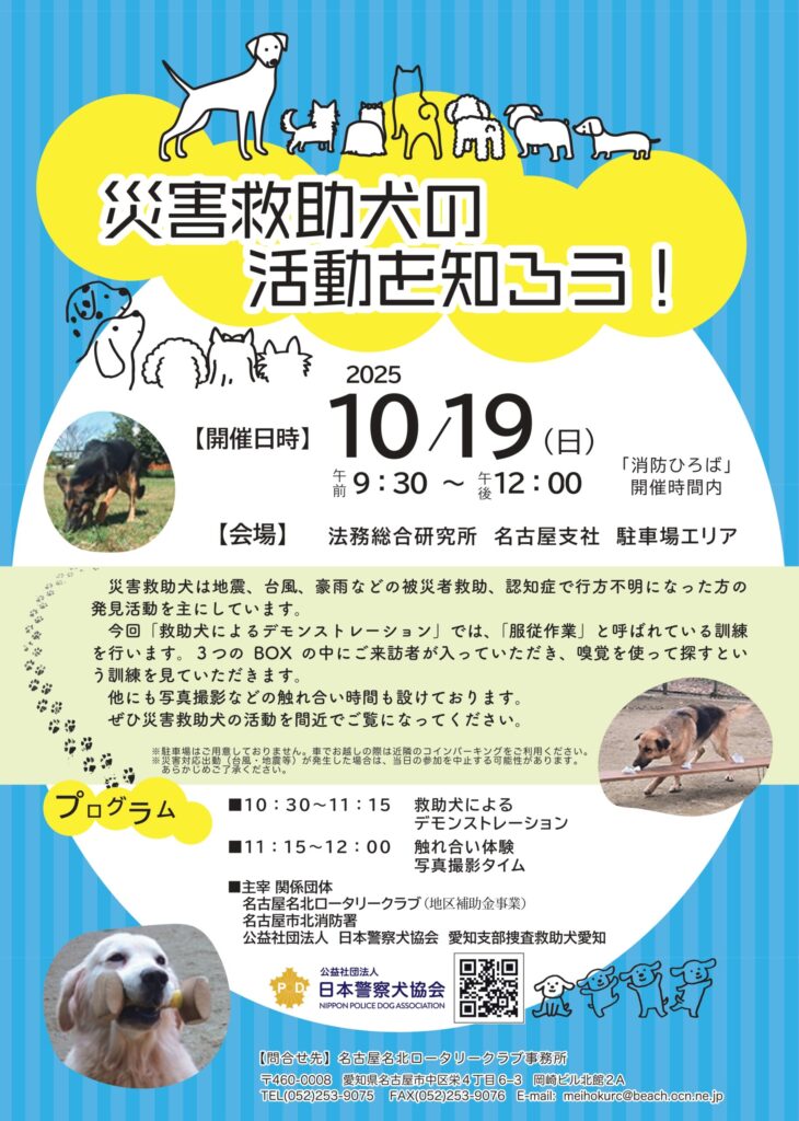 令和7年10月19日(日)地区補助金事業 災害救助犬PR事業を開催します!
